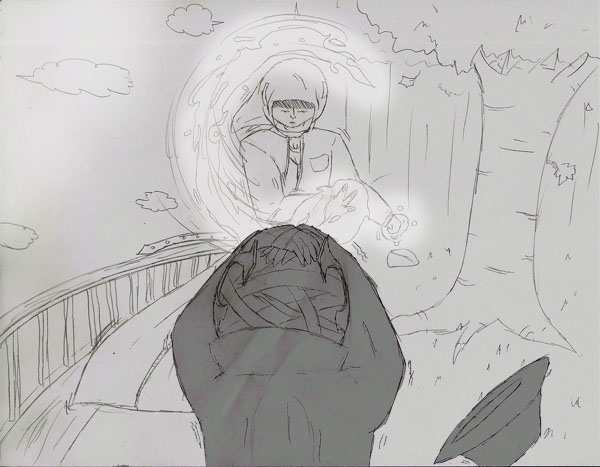 À l'aide de sa main droite, il traça lentement un immense cercle dans le vide. Un genre de portail bleuâtre apparut dans le vide.