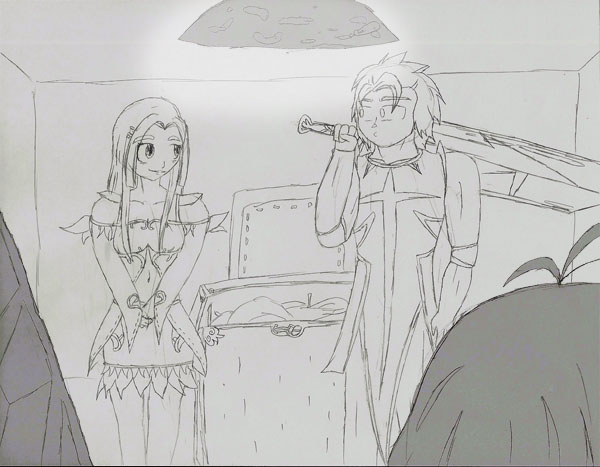 - Vous trouverez là-dedans tout ce qui reste de notre monde. Quelques armes et armures. Vous ne devriez pas éprouver trop de difficulté à trouver ce qui est fait pour vous...