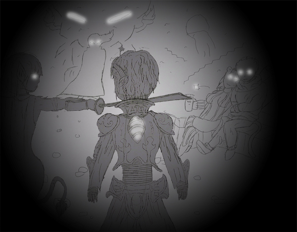 Elle qui tenait le katana bien fermement était aussi très poilue, mais avec des oreilles pointues. Une ecaflip. Un longue cicatrice traversait son visage de part en part. L'homme voulut répondre, quand la silhouette qui regardait toute la scène de haut sauta aux côtés de l'ecaflip. Elle s'avérait être une femme aux cheveux noirs qui cachait ses yeux avec d'étranges verres.